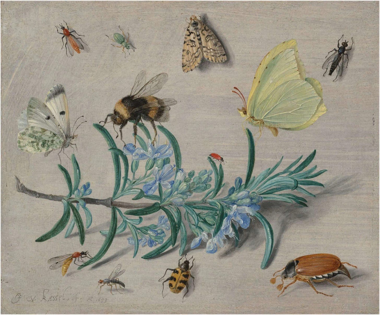 Insects and a Sprig of Rosemary, Painting by Jan van Kessel the Elder Painter (1626 - 1679), Painted in 1653, Oil on copper © National Gallery of Art, Washington. Christian.Art